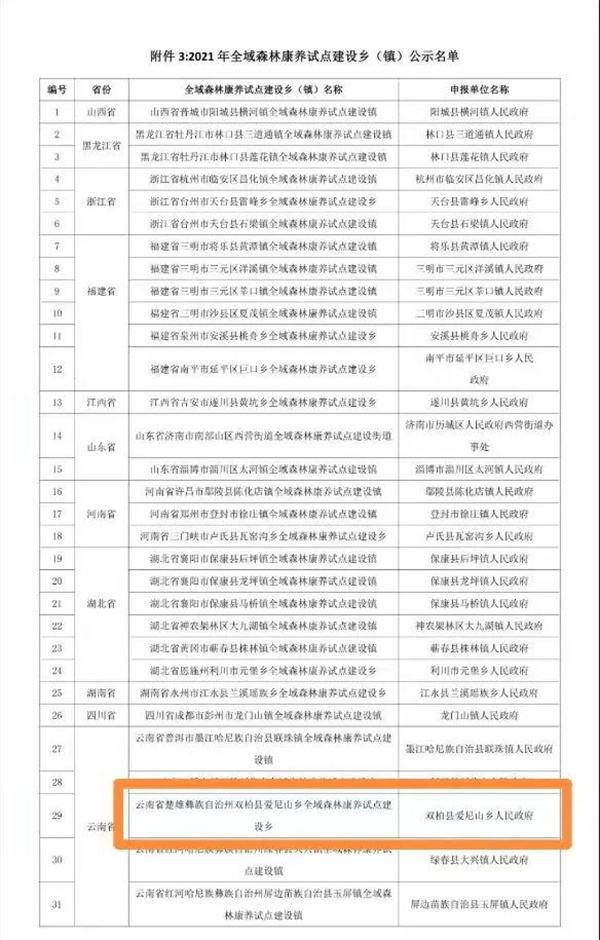 近日,中國林業產業聯合會公布了2021年國家級森林康養試點建設單位名單,雙柏縣愛尼山鄉成功上榜。這是繼今年入選第11批全國“一村一品”示范村鎮后,愛尼山鄉再度獲得的又一個國家級榮譽。