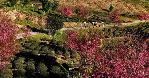 遠遠望去,一排排茶樹像一條條綠色的絲帶,縈繞于山間,一樹樹嬌美的粉色櫻花點綴其間,煞是好看。