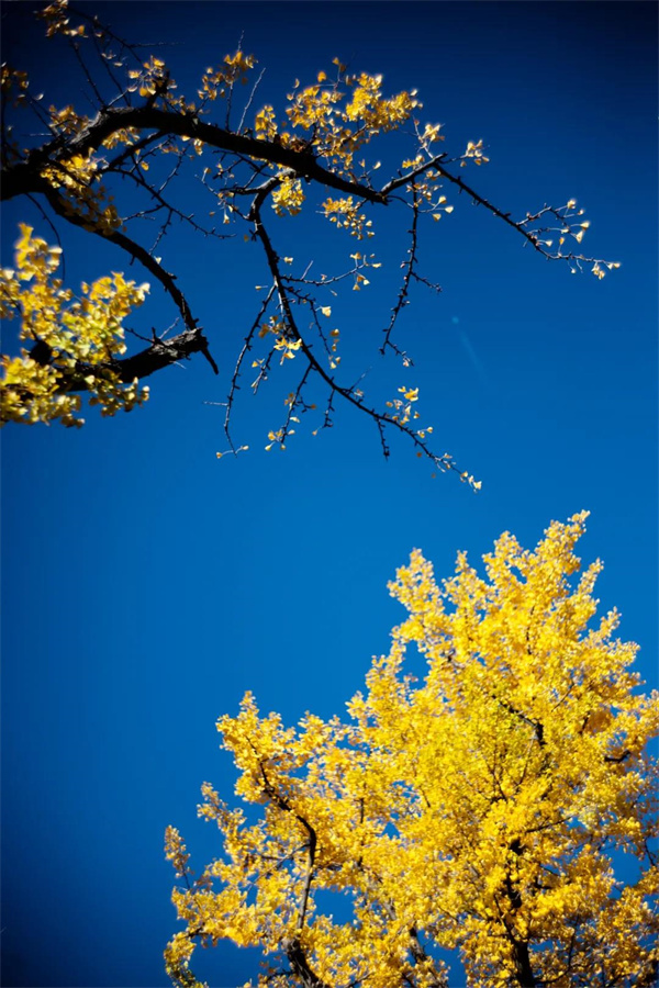 陽(yáng)光+藍(lán)天+金黃樹(shù)葉”的組合
