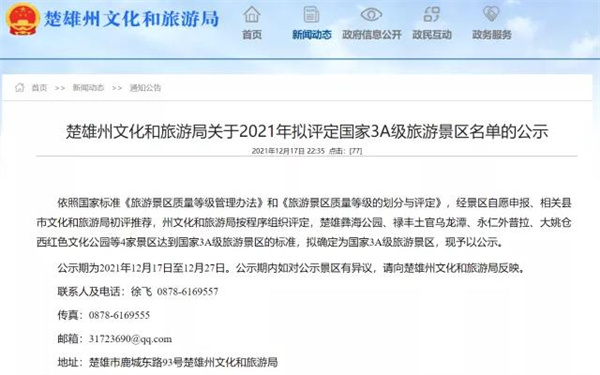 根據(jù)中華人民共和國國家標(biāo)準(zhǔn)《旅游景區(qū)質(zhì)量等級評定管理辦法》和《旅游景區(qū)質(zhì)量等級的劃分和評定》,經(jīng)景區(qū)自愿申報、相關(guān)縣市文化和旅游局初評推薦,楚雄州文化和旅游局按程序組織綜合評定,認(rèn)定楚雄彝海公園、祿豐土官烏龍?zhí)丁⒂廊释馄绽⒋笠}西紅色文化公園4家景區(qū)達(dá)到國家3A級旅游景區(qū)的標(biāo)準(zhǔn),經(jīng)公示無異議后,正式確定為國家3A級旅游景區(qū)。