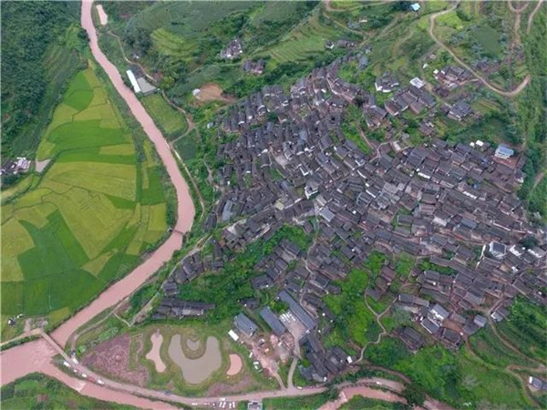 這里的房屋具有濃濃的彝族建筑特色,但又多為當(dāng)?shù)匾妥寰奂貐^(qū)不多見的上中下三層結(jié)構(gòu),削山為臺,壘石起地基,別有風(fēng)味。由于村落位于山坡,高差較大,空氣較好,村落景觀自然天成,有觀景臺、石樓梯、水塘民居、鎮(zhèn)山古樹、仙人趕石等多處景觀。