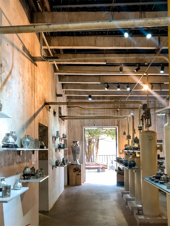 從接待中心左側(cè)出來,往坡上稍走幾步,就能看到那高調(diào)的「斑錫龍金屬藝術(shù)生活館」。這里也是氧氣廠車間的舊址,至今還保留著原來的樣子。這間金屬藝術(shù)生活館就地取材,把生產(chǎn)車間直接改造成了陳列館。