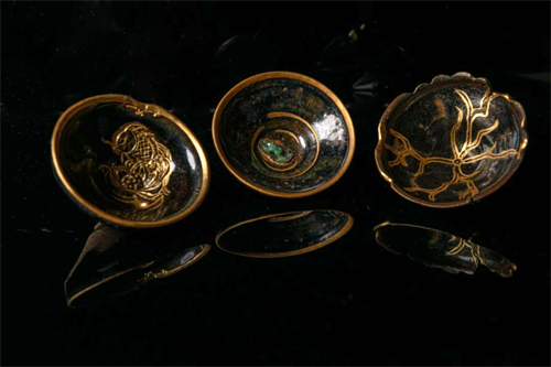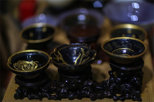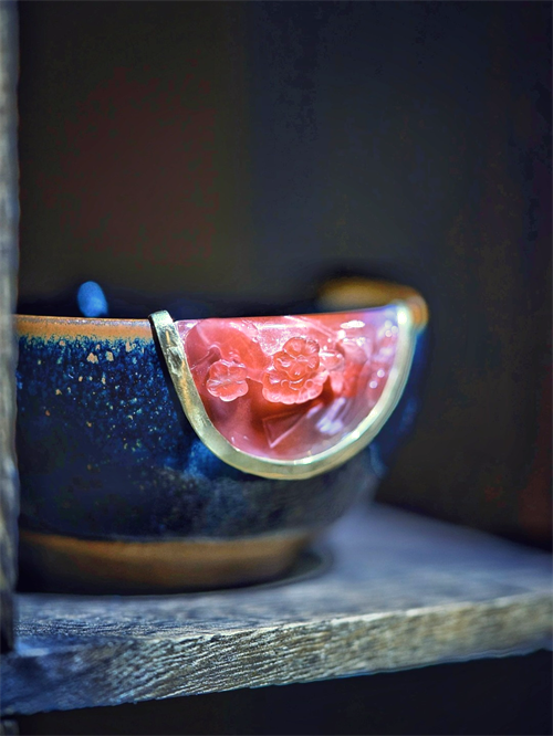《夢魂華夏》:承載著五千年的華夏文明,魂牽故里,夢回前世,流光溢彩中帶著斑駁的歷史印記,只需一眼,便是五千年的風雨飄搖......付忠華從河南、河北等多地博物館中汲取靈感,借助石料獨特的色澤和裂紋,雕刻出古代文物的出土場景。一方小小的建盞,有春秋的青銅器、宋代的陶器、遼朝的金器,選用遼寧岫巖縣的河磨老玉料全手工雕刻,24k黃金包邊和24K金幣制造完成,低調奢華,訴說著歷史演變的歲月沉淀,以及中華文化的博大精深。榮獲云南省工藝美術第十二屆“工美杯”銀獎等獎項。