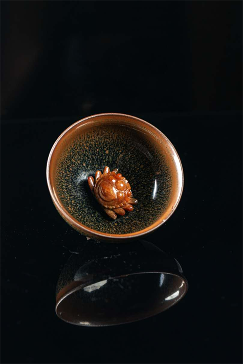 《燒尾》:宋,孔平仲 《孔氏談苑·燒尾宴》:“士人初登第,必展歡宴,謂之燒尾……又說:魚躍龍門,化龍時,必須雷電為燒其尾乃化。”本是宋窯遺址出土的殘次建盞,底部缺失,付忠華用翡翠在碗底處雕刻出一條青龍,將魚躍龍門時電閃雷鳴,天雷擊去魚尾、魚乃化身成龍的場景生動表現出來,透光而看,碗底的青龍澄凈透亮、潤澤又神秘。榮獲中國工藝博覽會“金鳳杯”銀獎等獎項。