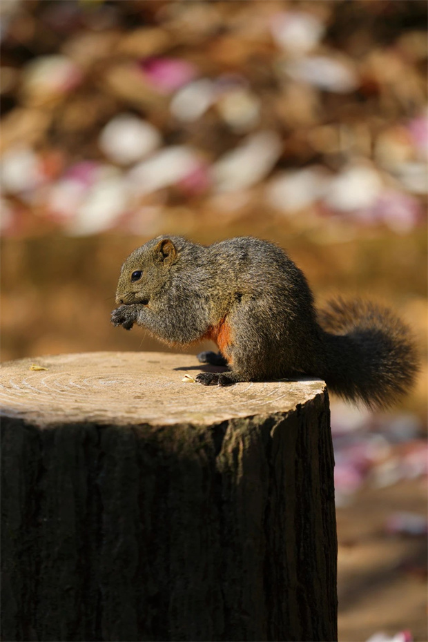 古亭旁、小徑邊,毛茸茸的小松鼠抱著松果張望,為這幅春日長卷添上靈動的注腳。就在春色滿園的微妙瞬間,仿佛有