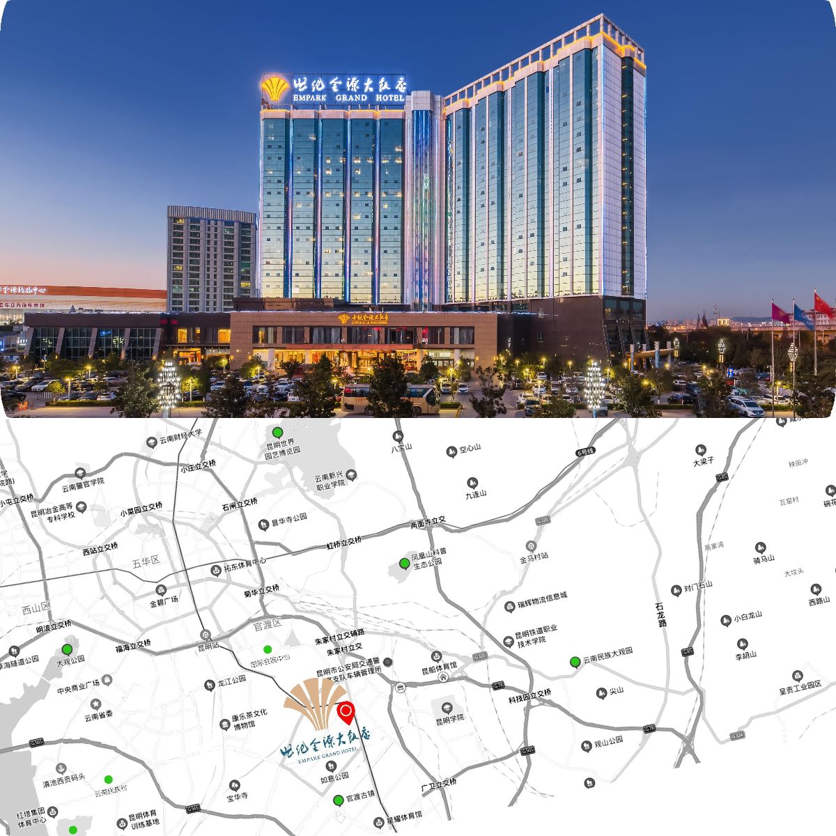 40 分鐘車程,距昆明火車站僅 20 分鐘,距離市中心 11 公里,距火車站 8.6 公里,無論是外地參會者抵達,還是本地參會者出行,都十分便捷。更值得一提的是,酒店依托昆明世紀城,靠近快捷的地鐵一號線,毗鄰東盟領事館區、金源國際商務中心,參會者在會議間隙,憑欄還可賞西山美景及風光旖旎的五百里滇池,在繁忙的會議之余能盡享自然之美。