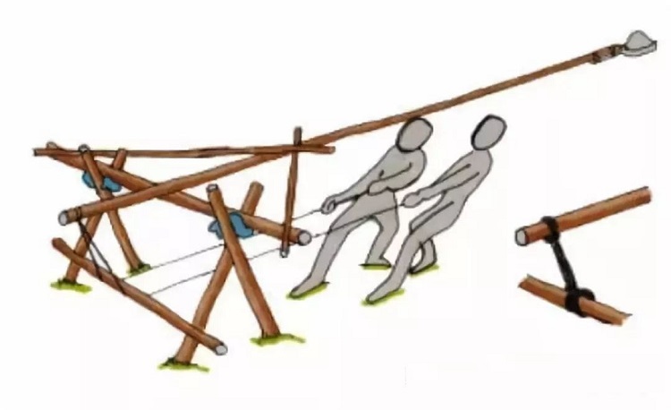 3、 拉動連接竹竿的長繩,炮架才能發射,竹竿通過杠桿原理彈射出炮彈。