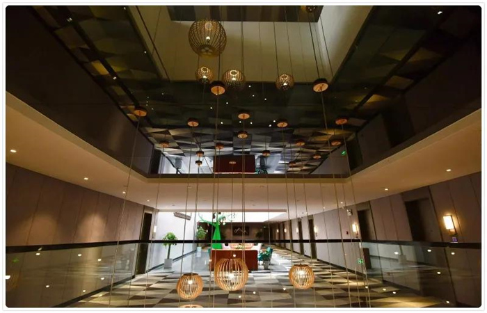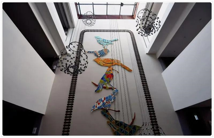 酒店中庭保留了大面積的采光玻璃頂,太陽光從天空傾瀉而下,為整個空間帶來時間和光影的變化。中庭的墻面用鐵軌和色彩斑瀾的各種小鳥來裝飾,以表現鐵路沿線美好的生態環境。酒店的二層有一棵安裝了火車信號燈的生命之樹,象征著客人和酒店越來越好的美好期待。三層有一個小小的火車站的候車點,輕輕坐下,仿佛在與歷史對話,實現一次時空的穿越。
