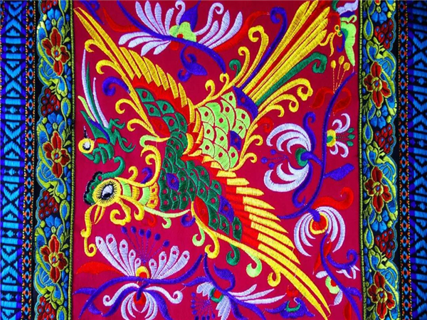 但無論哪一個“門派”,滇繡在色彩上都有一個相同點,那就是顏色慣用深色與暖色,以濃艷為主,色塊絢麗,構圖舒朗,呈現出粗獷質感、五彩斑斕、富于生命力的特點。對山川神靈的崇拜和自然人文的敬畏,融匯在一針一線間,成為地區內的文化符號。