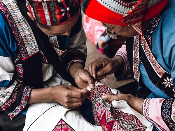 石林彝族撒尼人的傳統刺繡工藝對于針法就比較獨特,她們有一招傳統絕活叫“挑花”,也稱作“挑織”,還有“十字花繡”和“路南挑花”。