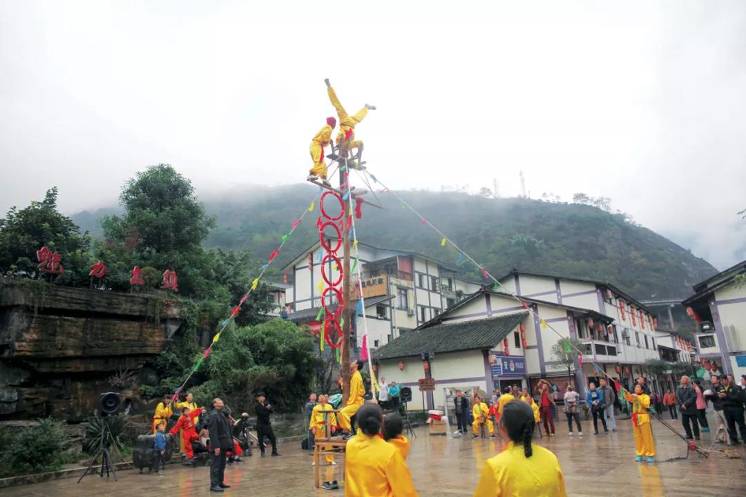 從昭通水富南下,山谷里綠意盎然,云霧繚繞中,隱約能看到數(shù)枝茶花盛開,驅(qū)逐了清晨的一絲寒意。往宜賓方向走,萬畝茶花林深處,是興隆高竿獅子舞的故鄉(xiāng)。