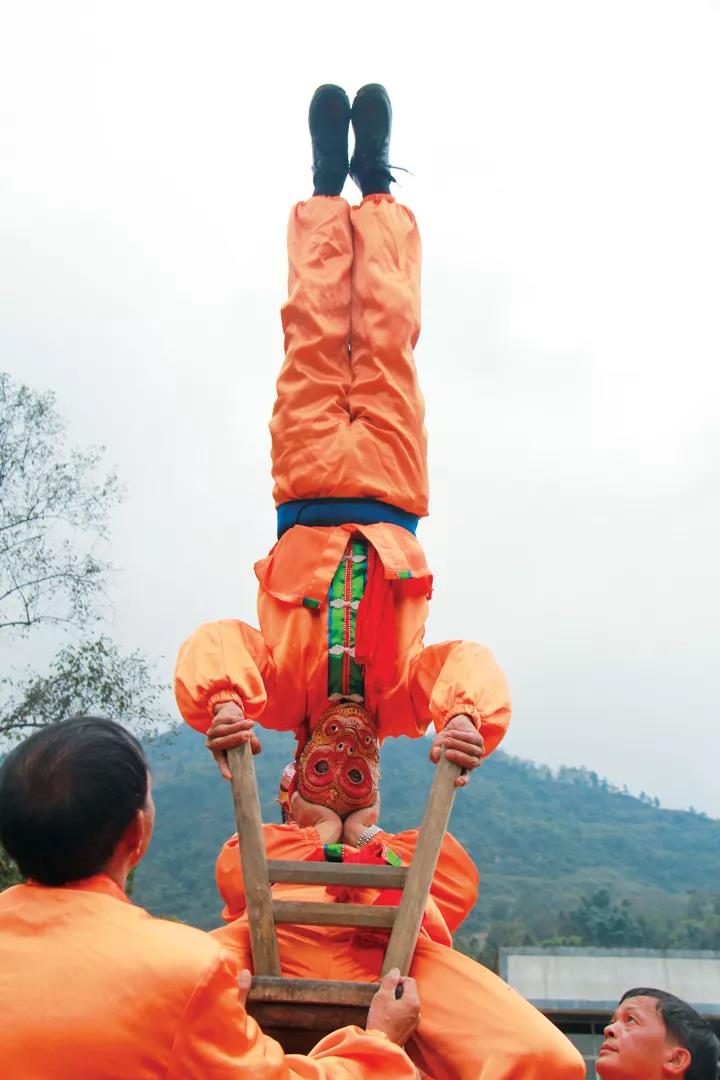 高竿舞獅是所有舞獅動(dòng)作中最精彩的表演形式,主要在一根長(zhǎng)約6米的竹竿上進(jìn)行。竹竿直立在一張?zhí)刂频淖雷由?,竹竿的上面綁上一根倒立的板凳,稱為“翻天云”。兩人組成的“獅子”沿著竹竿,徒手攀上高空,在高空四方朝拜,表演內(nèi)容包括高空倒立、匍、跌、翻、滾、栽倒樁、懸空倒吊等。在高空中,表演者需要完成“一柱擎天” “龍頭鳳裝” “倒掛金鐘” “空中懸獅” “白馬獻(xiàn)蹄” “鷂鷹展翅”等高難度項(xiàng)目,需要非凡的平衡能力。