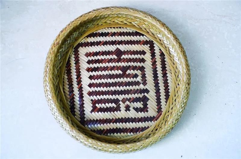 每年立秋到開春之間是砍伐竹子的最佳時(shí)機(jī)。開春后,天氣熱,水分重,不宜砍伐??诚碌闹褡臃湃氪箦佒杏梅兴笠粋€(gè)小時(shí),或在火上炙烤,目的在于消毒??诚轮窀椭裆?,保留竹竿中部。一根直徑 10 厘米的竹子,縱向剖成上百只竹簽,再橫向剖開薄薄十幾層,成為適合編織的竹片。李加云拿來一個(gè)直徑 15 厘米的果盤,看上去面積不大,掂量起來十分輕巧,卻用了 100 根 70 厘米長(zhǎng)的竹片做邊沿,金竹片和黑竹片各 70 根做底部。