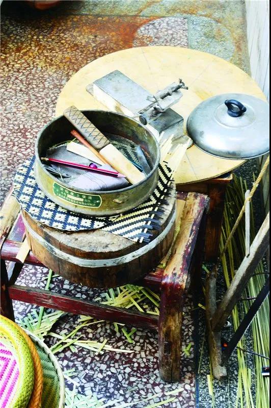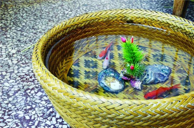 在李加云住所二樓茶幾上的竹編魚缸,頂部隨著時(shí)間的遷移有了少許磨損,但整個(gè)竹缸仍滴水不漏。魚缸里 3 條金魚腮部一張一翕,不時(shí)輕快游弋。
