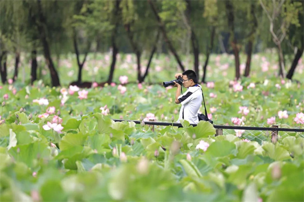 湖內(nèi)種有荷花,夏季來臨時,這里成為人們賞荷花的佳地。“六月荷花香滿湖,紅衣綠扇映清波。”那蓮葉田田,菡萏妖嬈的畫面,被攝影師留在了一張張照片中。