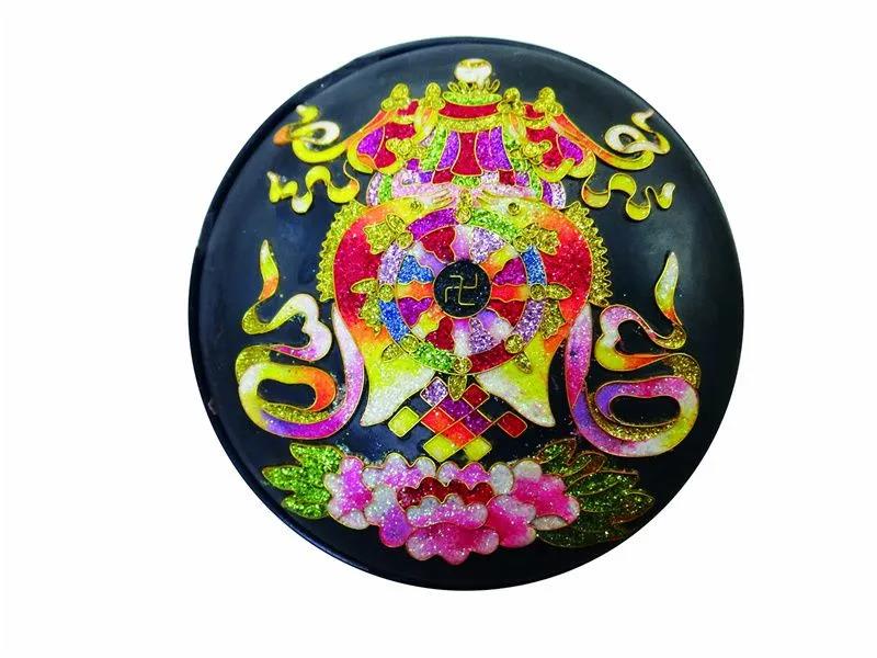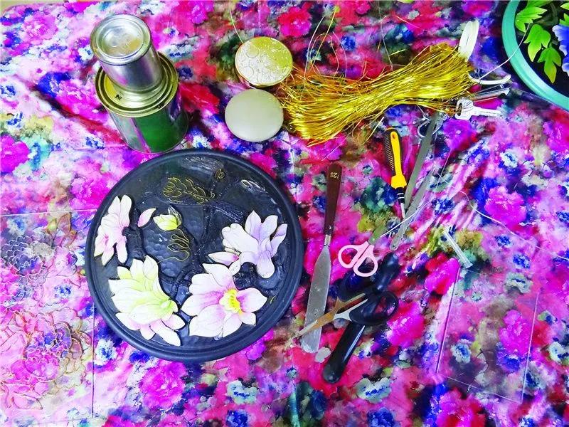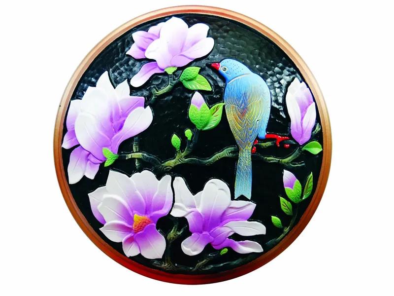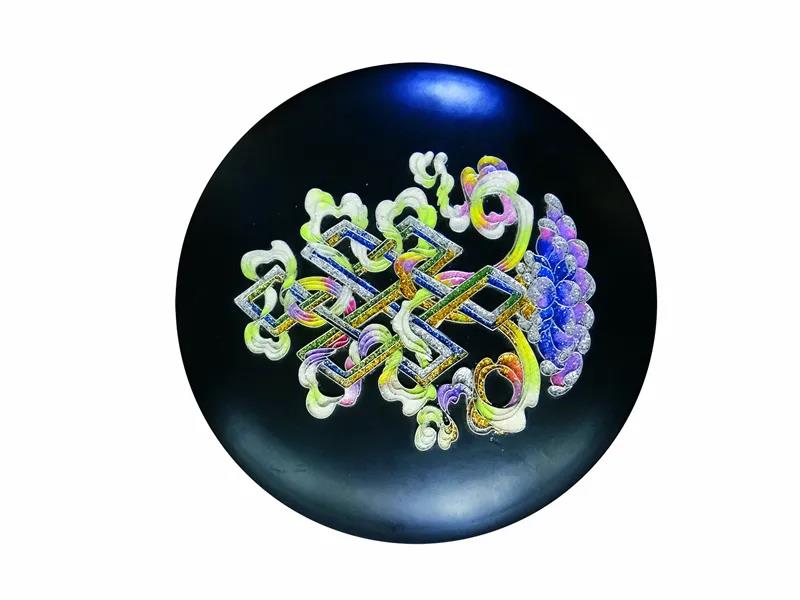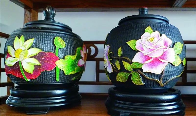 傳統的景泰藍制作工藝為:先描圖后掐絲,再上釉,后反復燒制,工序可達上百道。而云南掐絲彩嵌黑陶是將釉料燒制好研磨成細粉再掐絲作畫,將五彩艷麗的釉料粉鑲嵌在黑陶上,將原來的上百道工序簡化為十多道工序。成品具有防水、防腐,不易褪色的特點。