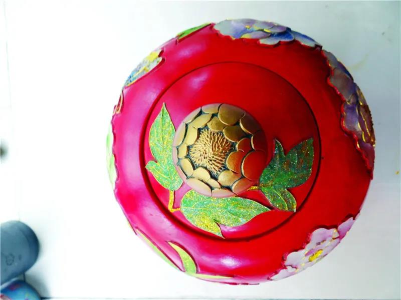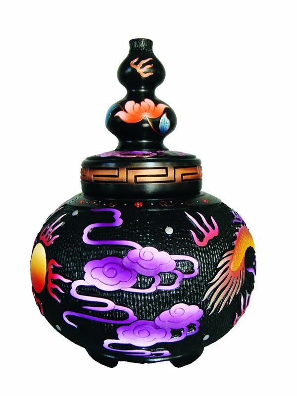 大紅的底色上,金絲勾勒出的數朵牡丹花嬌艷綻放,幾只蝴蝶在上面翩翩飛舞,點綴其間的金粉若隱若現。這是掐絲彩嵌黑陶工藝品“寶葫蘆”,由三個部分組合而成,聚寶盆寓意聚福聚財,中部和瓶頸組成的花瓶寓意平安。