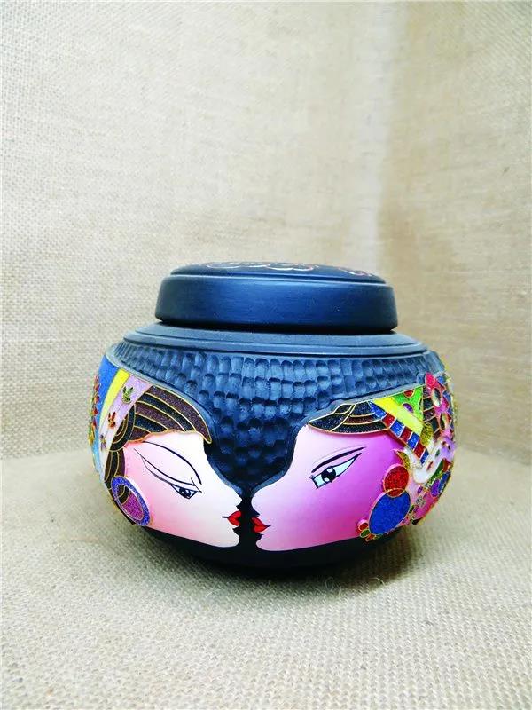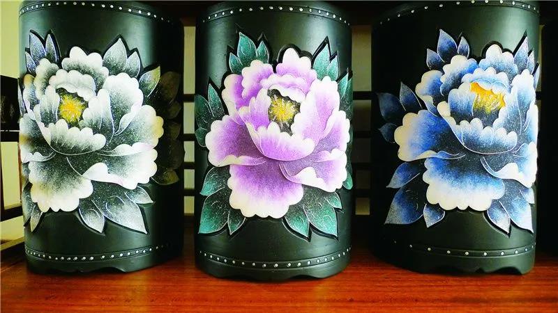 除掐絲彩嵌黑陶外,學習“云南畫派”畫家的黑陶彩繪系列產品,運用了云南重彩畫工藝,用不浸水不褪色的丙烯顏料,在燒制成的半成品陶體上做畫,最終形成具有濃郁云南民族特色的黑陶重彩工藝品。