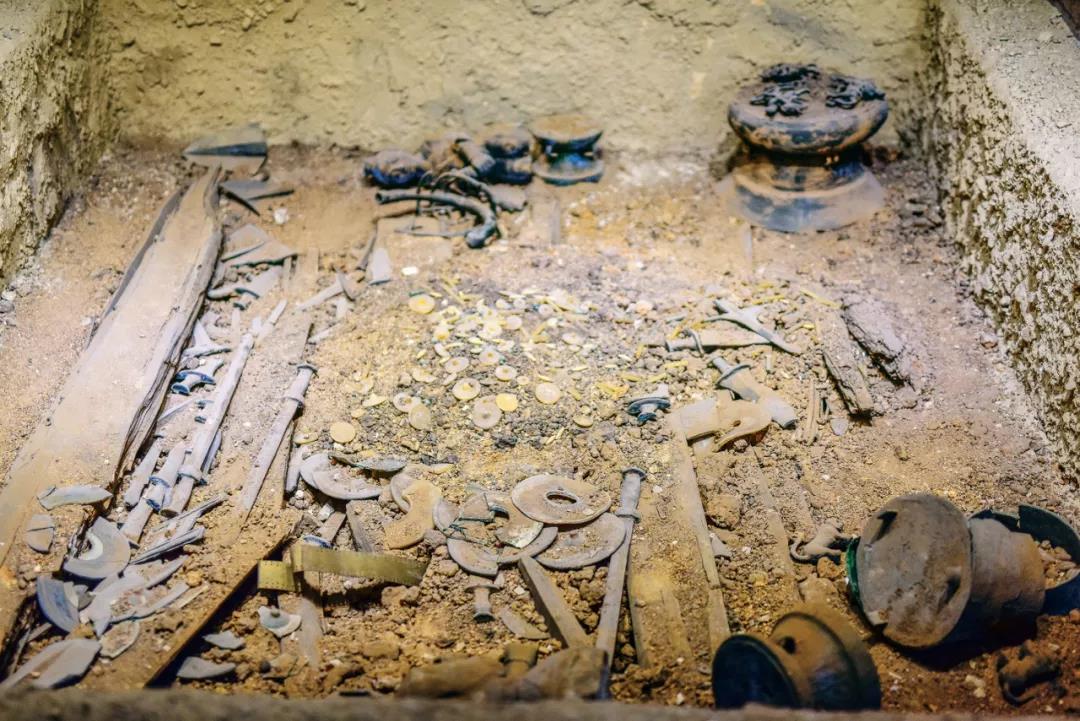 牛虎銅案,一件1972年出土自李家山遺址的青銅器,也把我們拉回到兩千多年前的那個早晨。那是戰(zhàn)國晚期,古滇國王侯逝世,墓地選在江川縣李家山,在貴族的指揮下,奴隸們把長達3.27米的槨安置在墓底,棺槨之間,墓穴的東、西、北三面,隨葬了上百件器物,以青銅器為主。器物層層放置,每碼滿一層器具附上一層土,形成豎穴。陪伴墓主人一起待在棺內(nèi)的,是銅枕、裝飾品、銅卒和部分兵器。