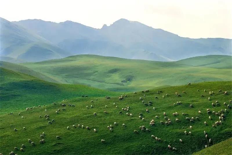 白云鋪在山頂,陽光灑在起起伏伏的草毯,牛羊走在山坡。