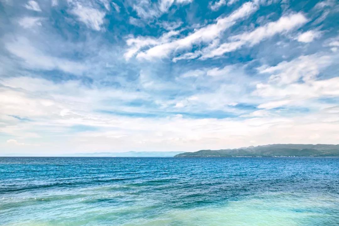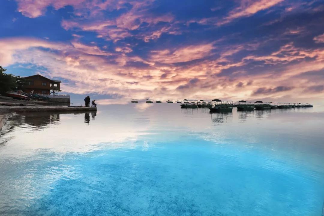 撫仙湖就像它的名字一樣充滿仙氣,湖水藍得晶瑩剔透,如寶石般鑲嵌在群山之間。從日出到日暮,蔚藍的天空與純凈透藍的湖水交織,勾勒出水天一線的美麗畫卷。